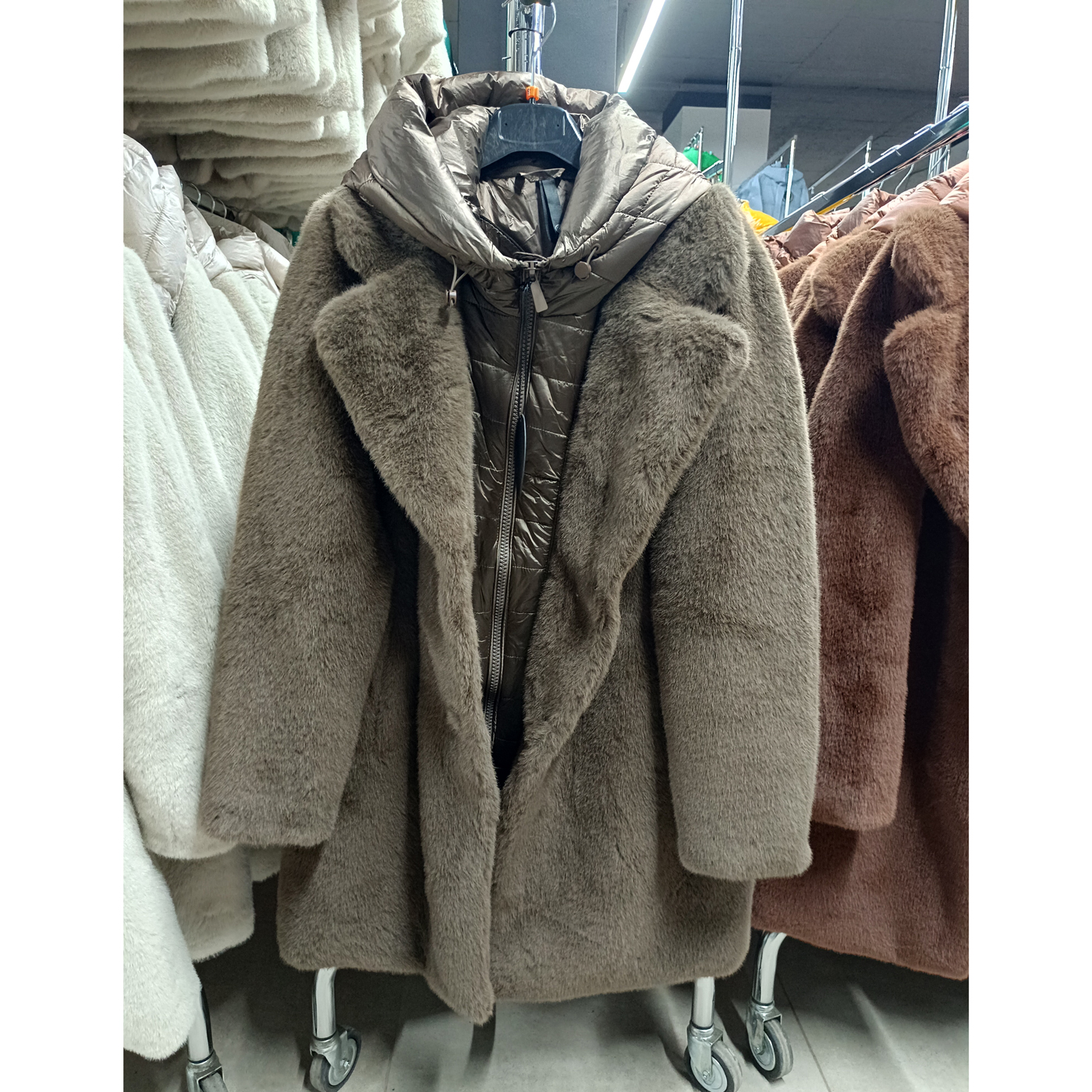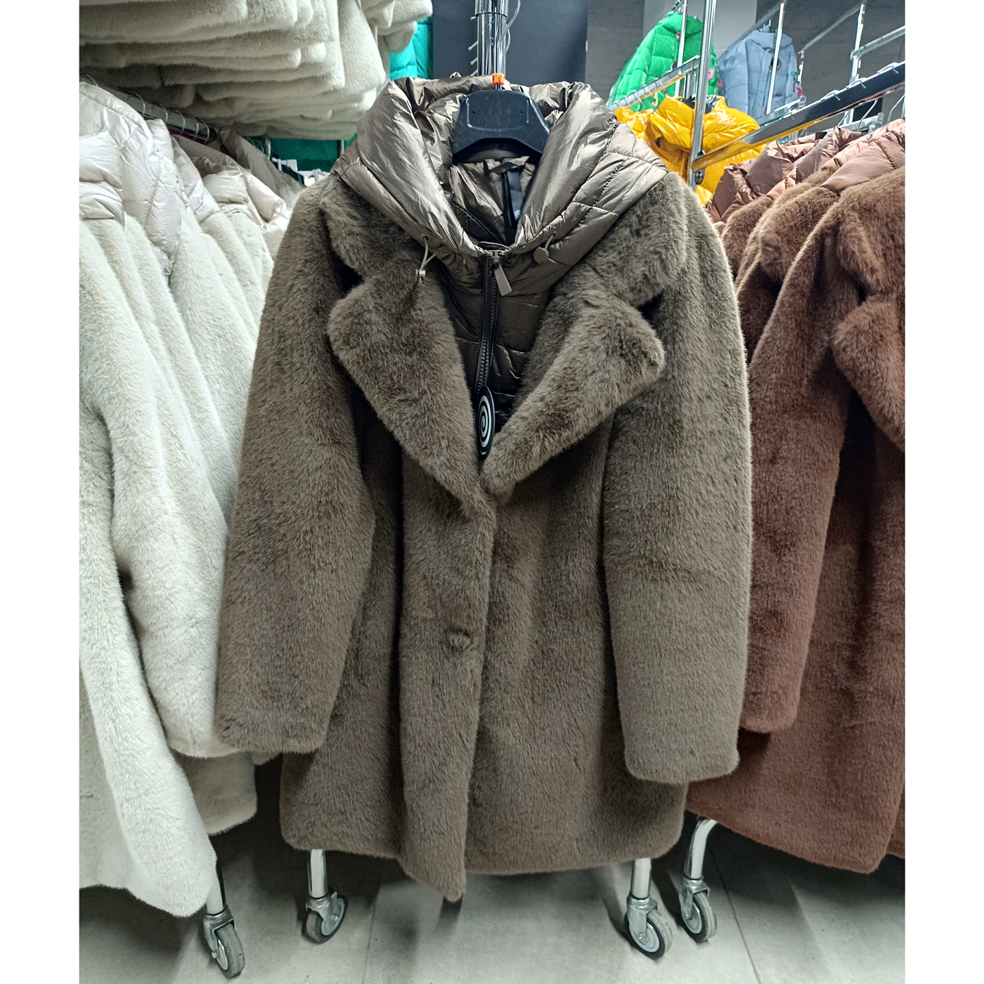 Trendy műszőrme kabát és steppelt mellény kombinációja ami egy igazán különleges megjelenés kölcsönöz. Belsejéből a steppelt mellény rész eltávolítható, ebben az esetben egy hagyományos bunda ként is hordható.