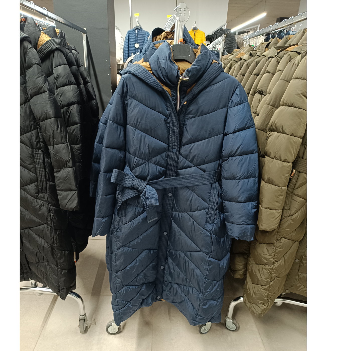 Női hosszú steppelt kabát, fix kapucnis – FLY 2309