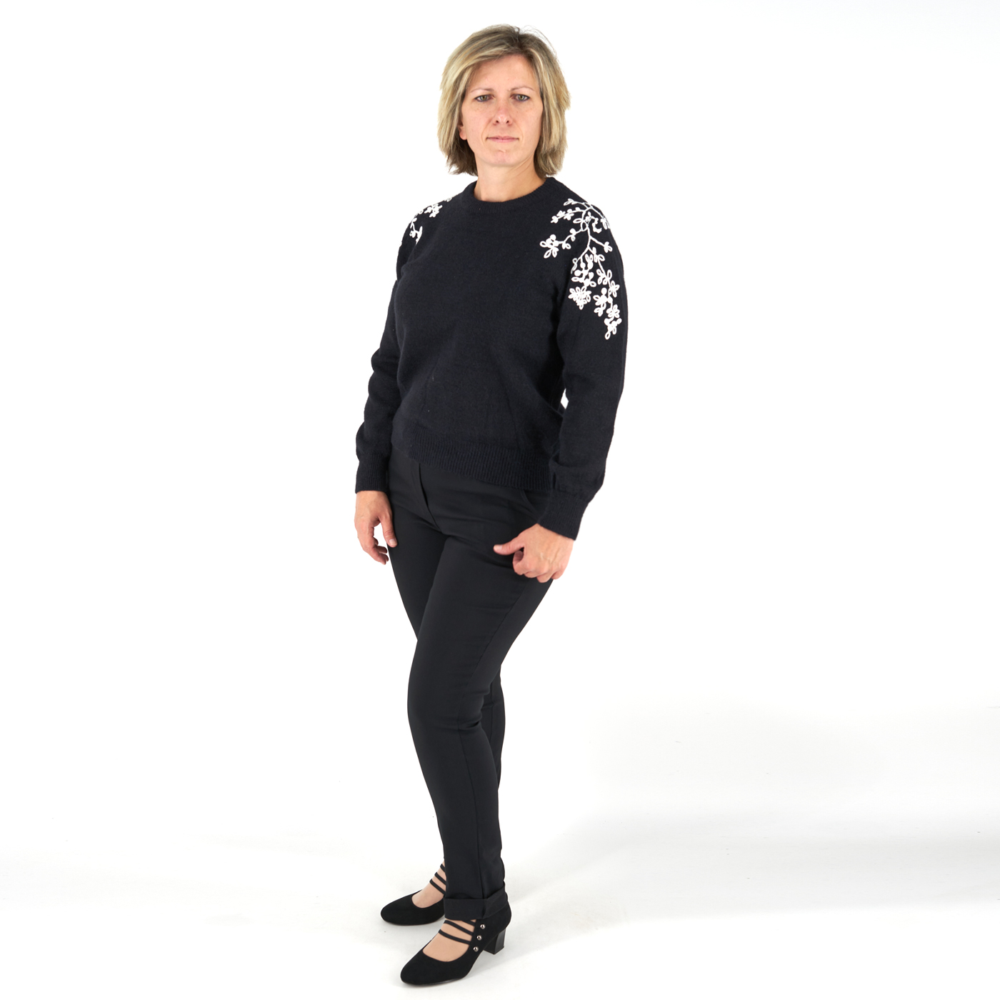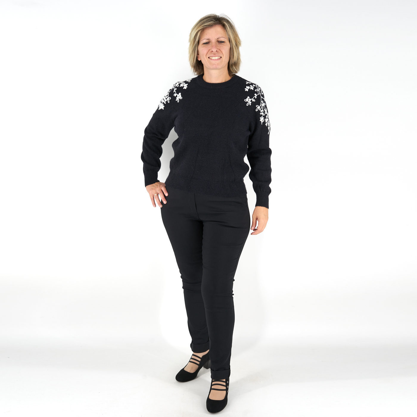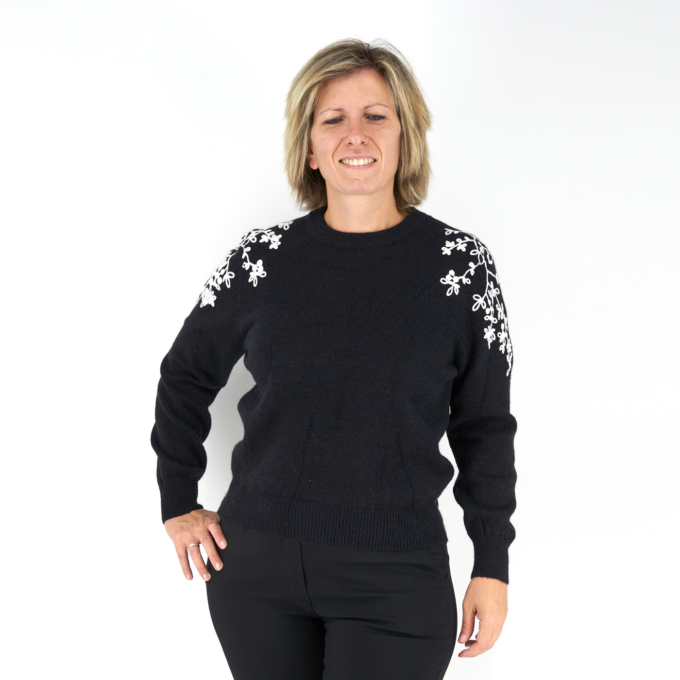 Vállán hímzett női kötött pulóver – ZS3095 – Fekete